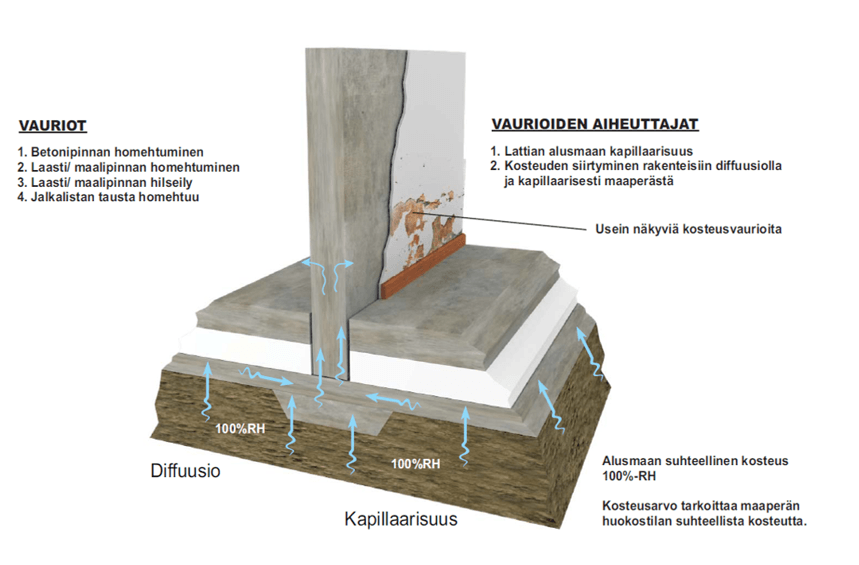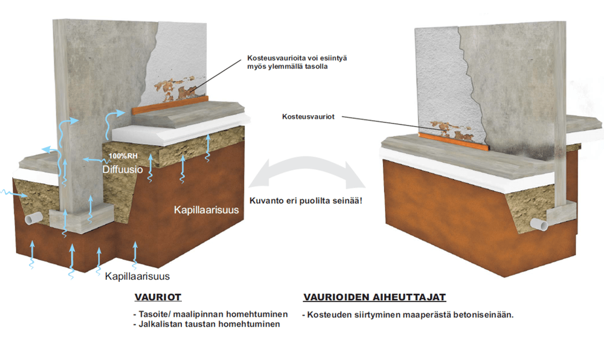 Puuttuva tai huonosti toimiva vedeneristys: Jos sokkelin ja seinärakenteen välissä ei ole kunnollista kosteuseristystä, kapillaarinen kosteus voi siirtyä myös ylempiin rakenteisiin.
